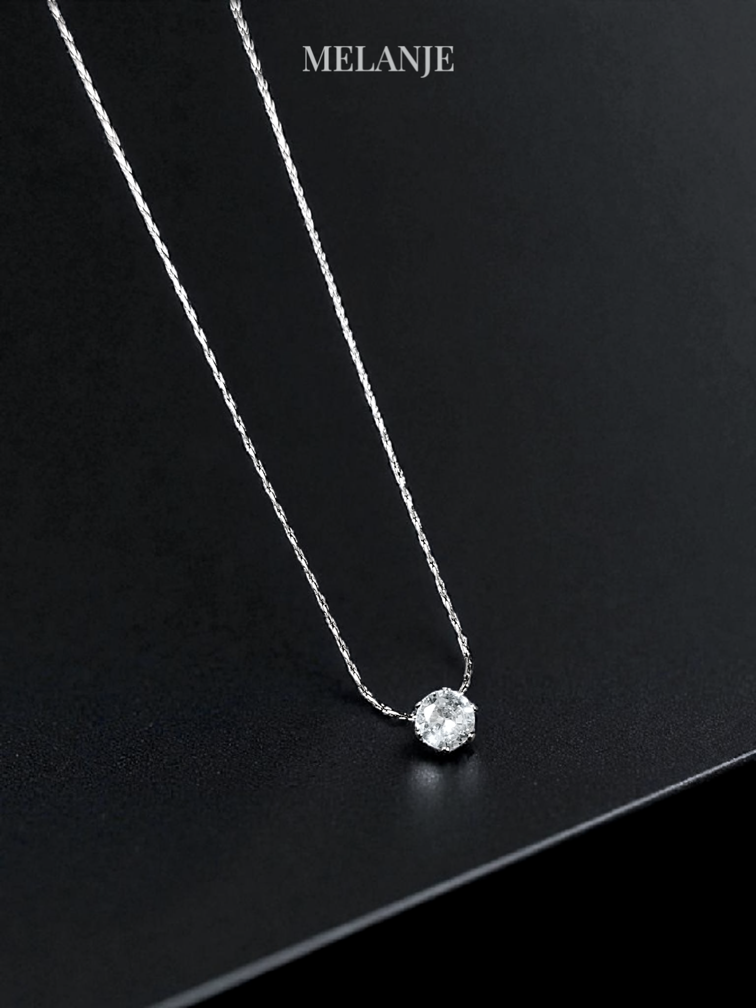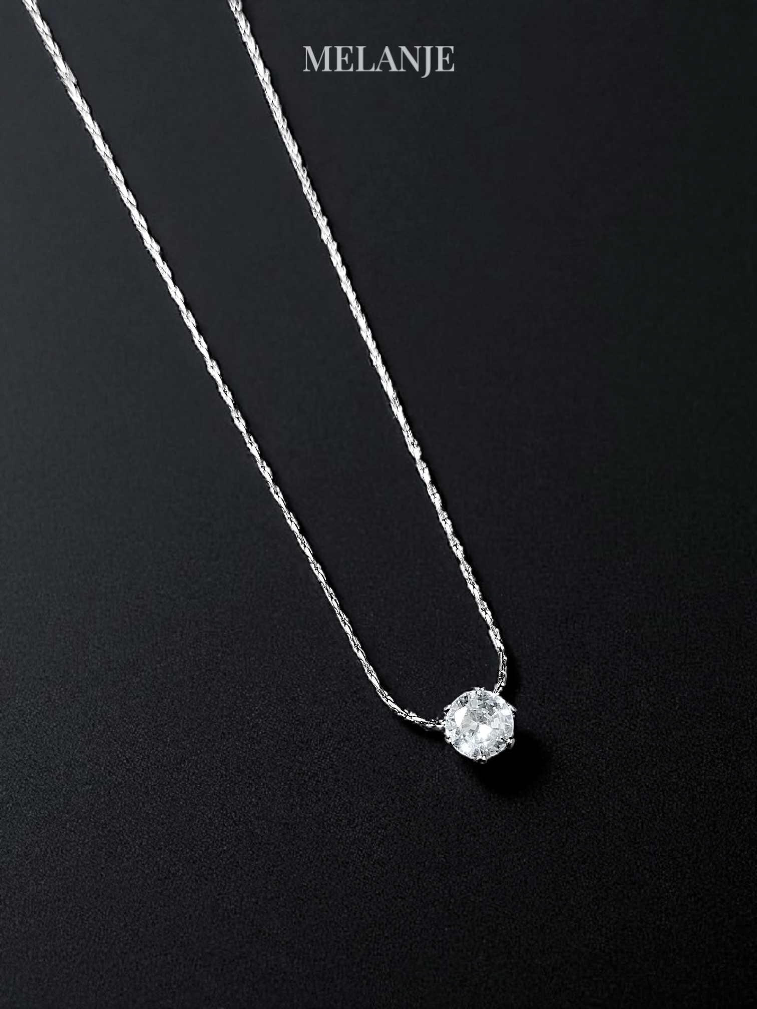 - Dainty solitaire pendant featuring a round clear zircon crystal