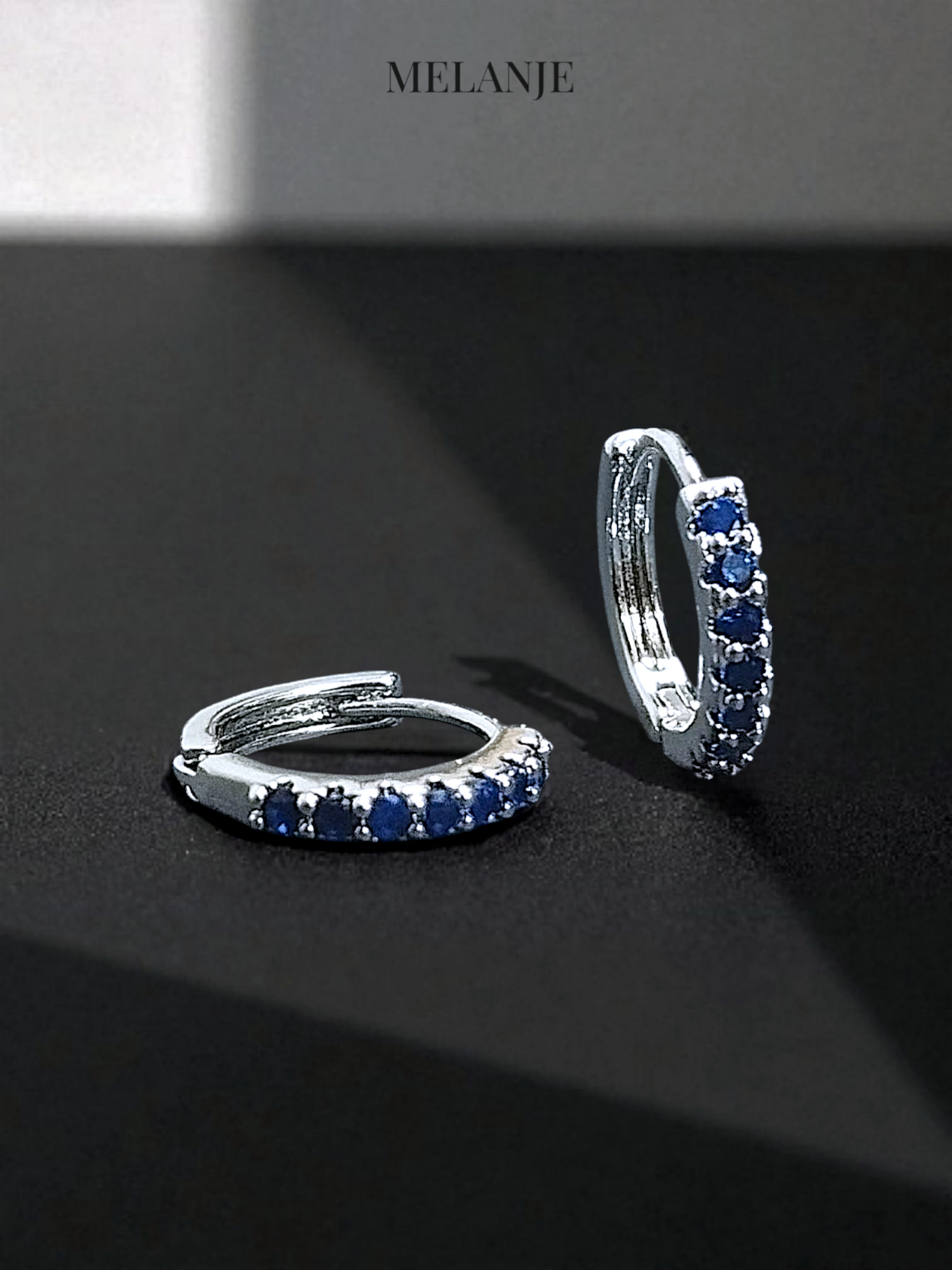 - Minimalistic huggie hoop earrings accented with sapphire blue cubic zirconia