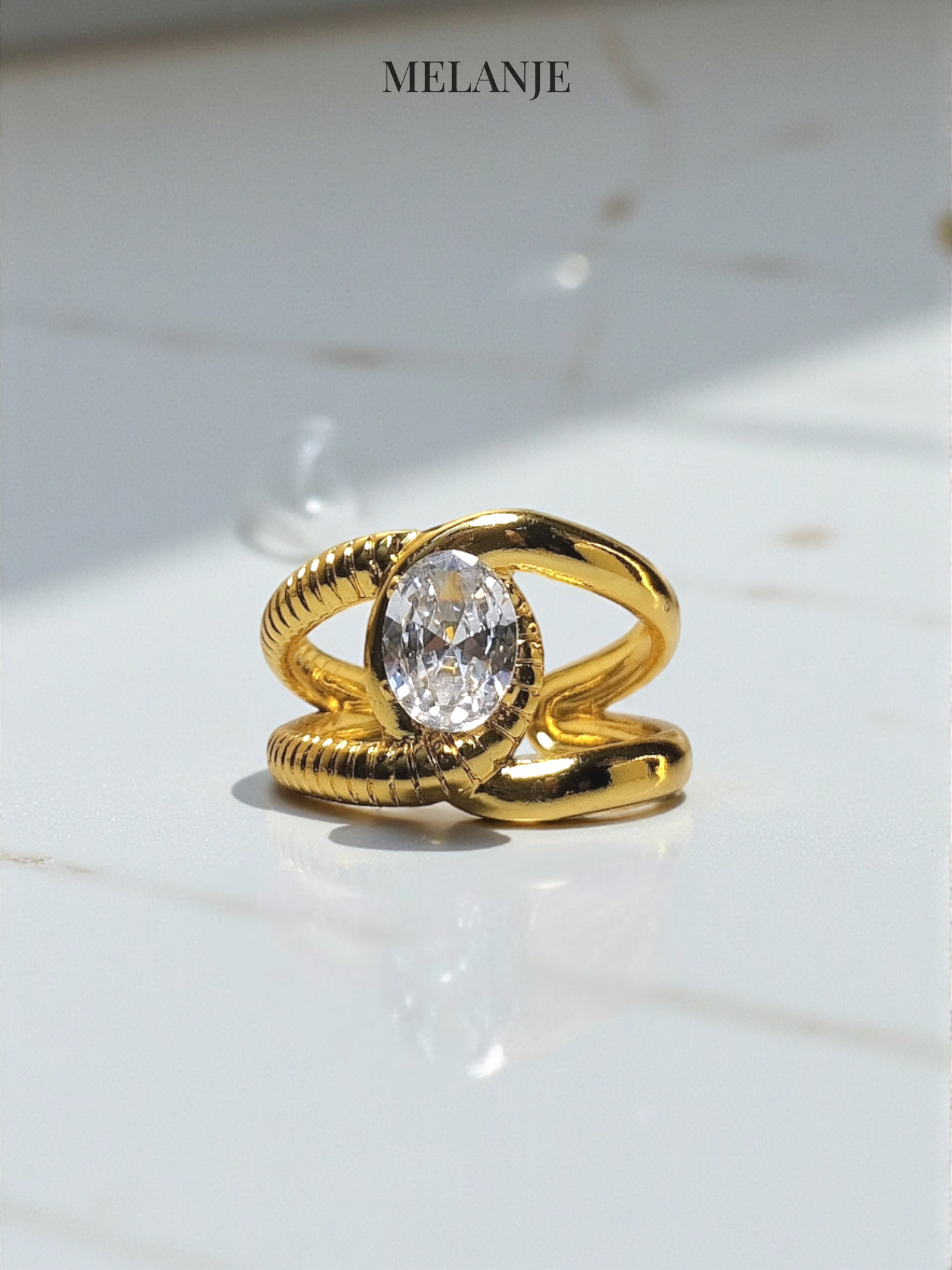 - Stainless steel chunky gold ring with an elegant oval clear zircon centerpiece